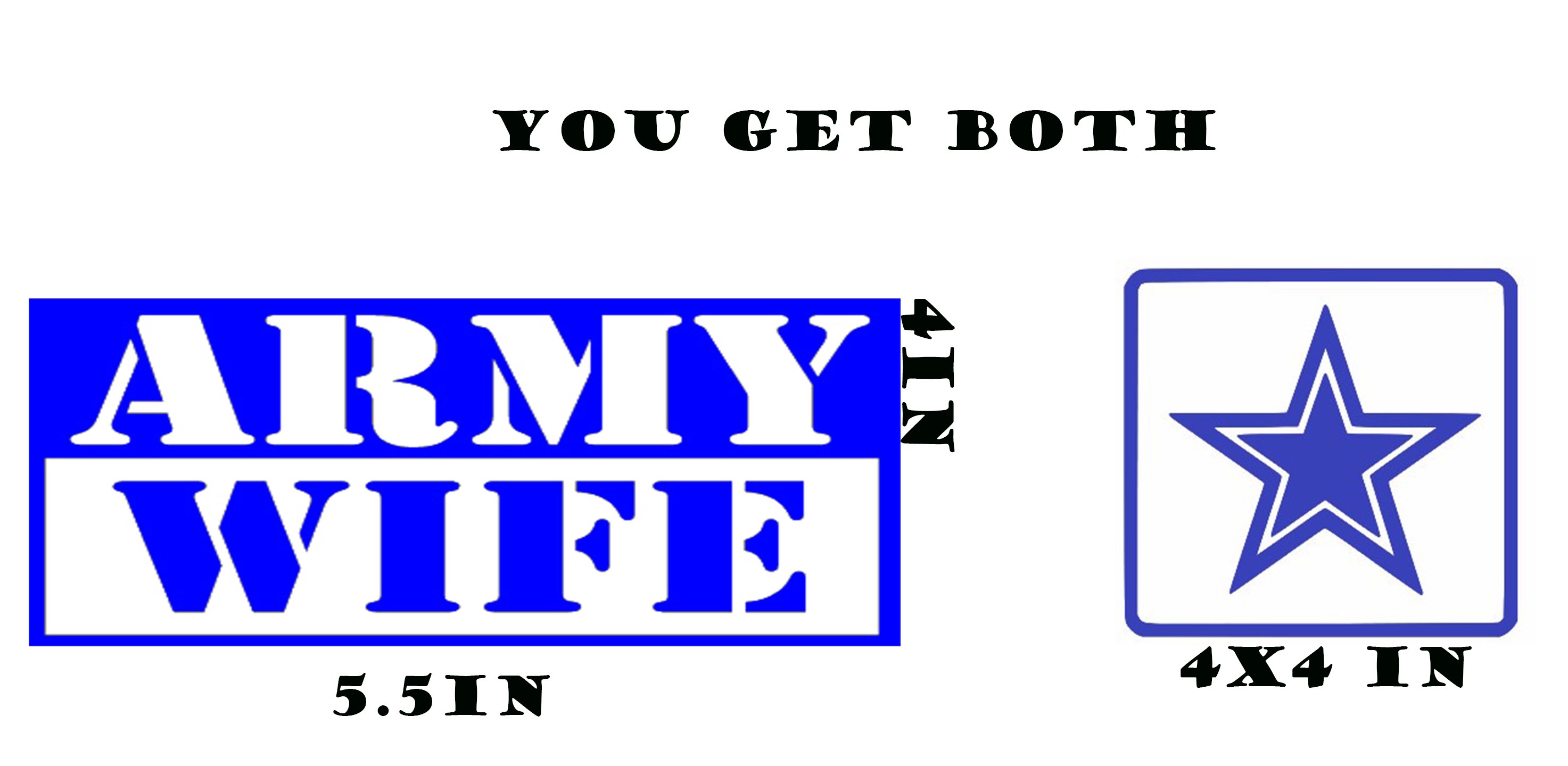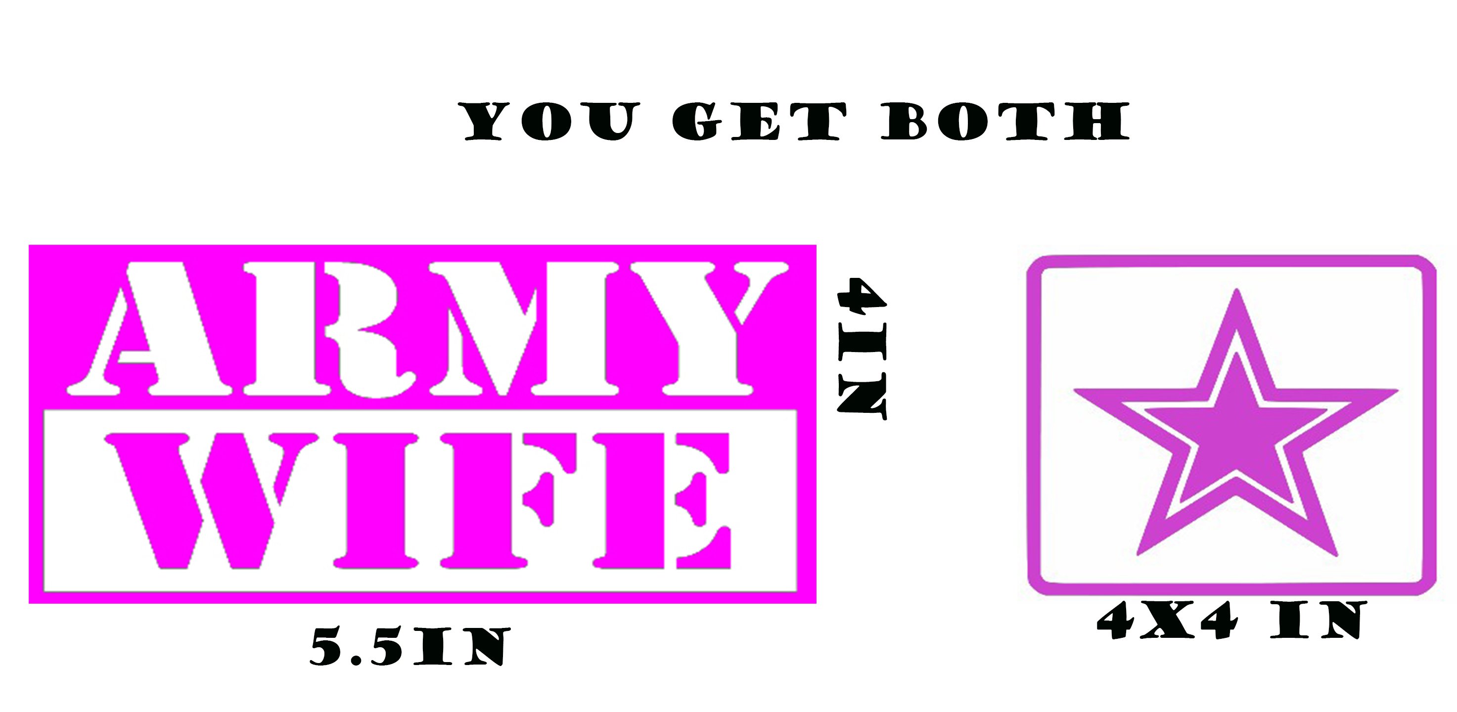 Military combo decal stickers. Army wife lettering and Army star. You get both decals. Measurements are in the picture. 5x4 and 4x4