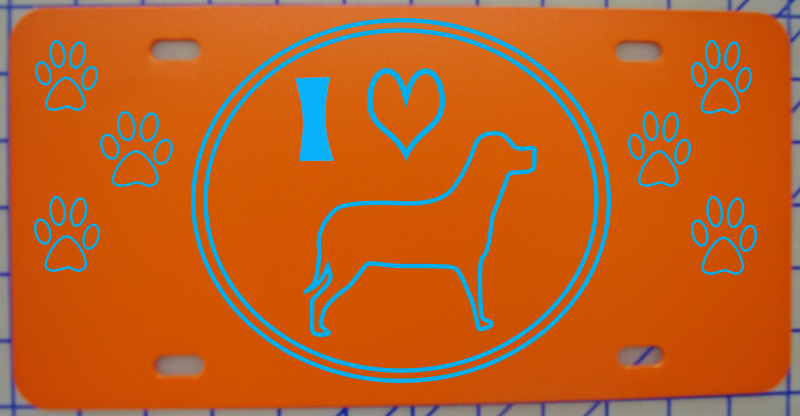 I love my dog license plate. Red plate with sky blue vinyl graphics.