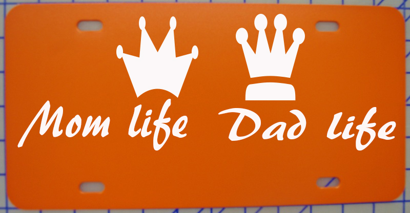 Mom and Dad life custom license plate. Orange license plate with white lettering King and queen crowns. Our vinyl is UV and weather resistant. Easy to clean and plate is flexible poly. This custom made license plate would make a great gift or for yourself.