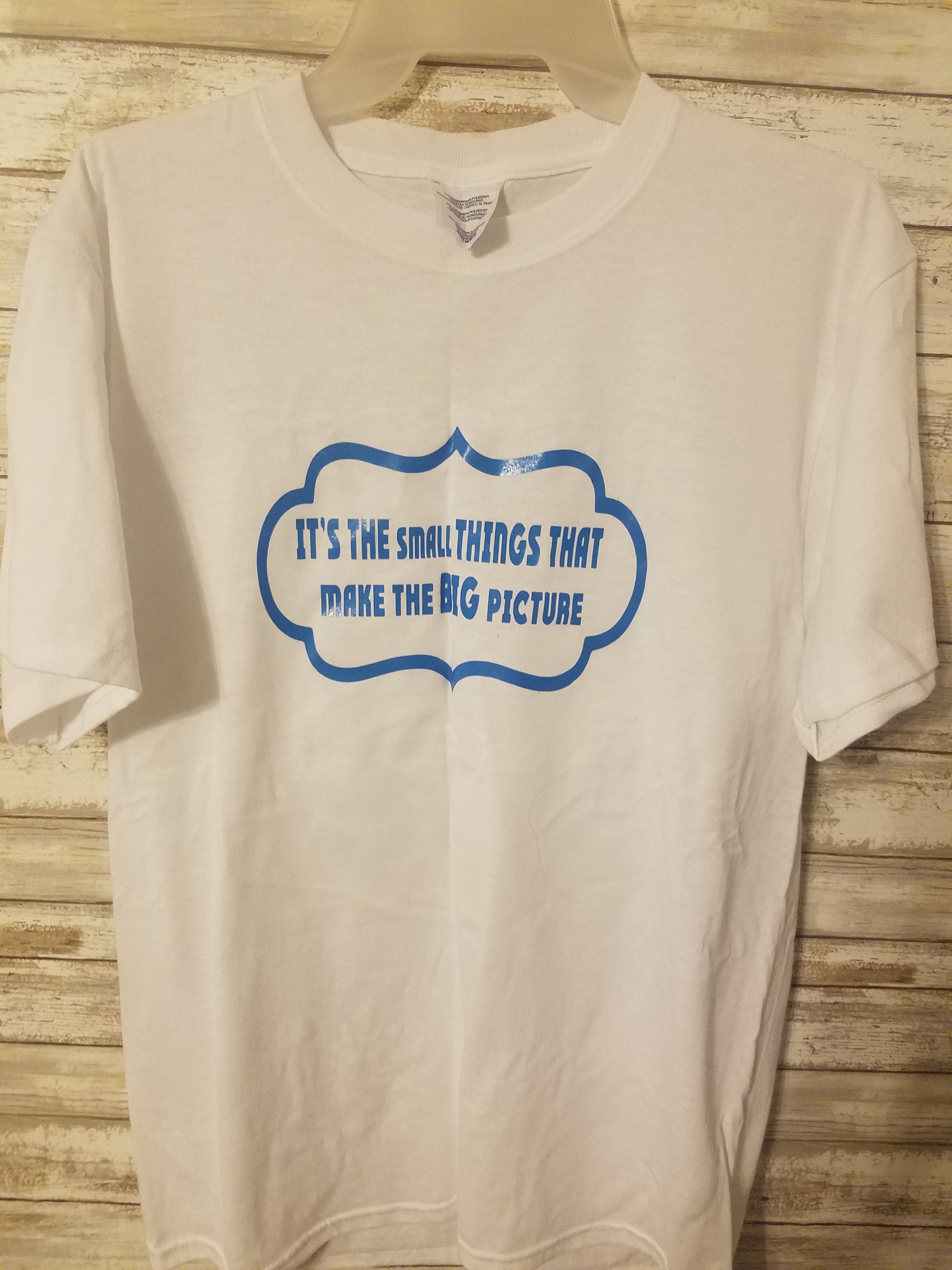 Cotton/cotton blend t-shirt. White tee, various sizes available. Our t-shirts are true to size and preshrunk.