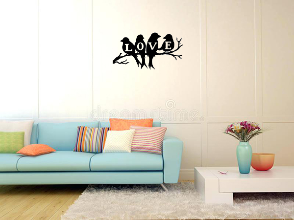Love birds sitting on a tree branch vinyl wall decal sticker. The love word becomes the background of the color of the wall you stick this on.